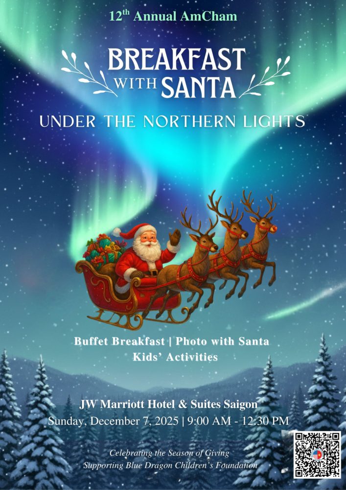AmCham proudly presents the 12th Annual AmCham Breakfast with Santa, a family-friendly celebration that also makes a difference. It will be on December 7, 2025, from 9:00 AM to 12:30 PM at the JW Marriott Hotel & Suites Saigon.