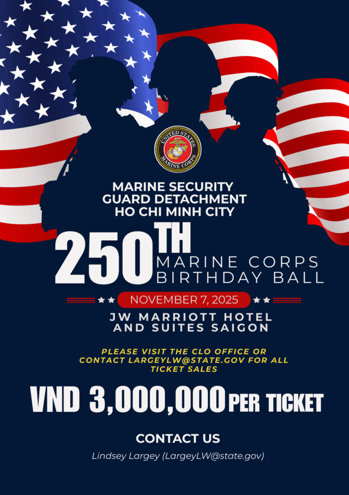 This is an invite-only event that the U.S. Consulate General in Ho Chi Minh City opens to AmCham members. The United States Marine Corps Birthday Ball is an annual formal event that celebrates the founding of the U.S. Marine Corps. The U.S. Consulate General in HCMC has a Marine Security Guard Detachment that not only protects us, but they are also active in the local community and do community service. The ball celebrates them and their contributions to our community.