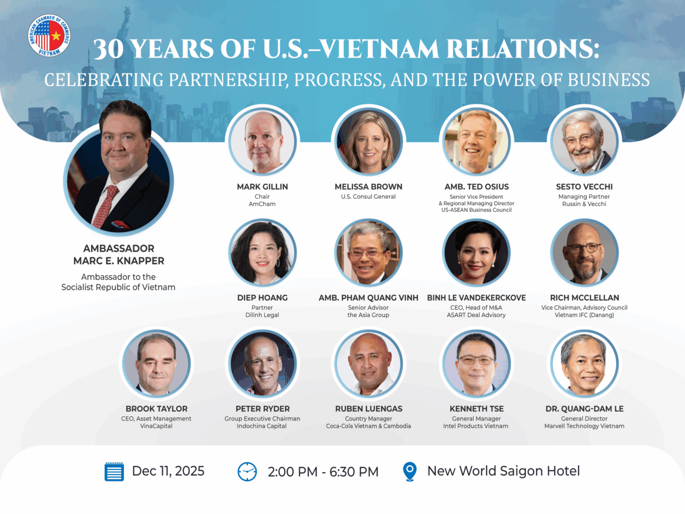 To celebrate this milestone, AmCham Vietnam in HCMC will host a special event bringing together leaders from government and the private sector to reflect on how far we’ve come—and to explore what’s next for the U.S.–Vietnam business relationship.