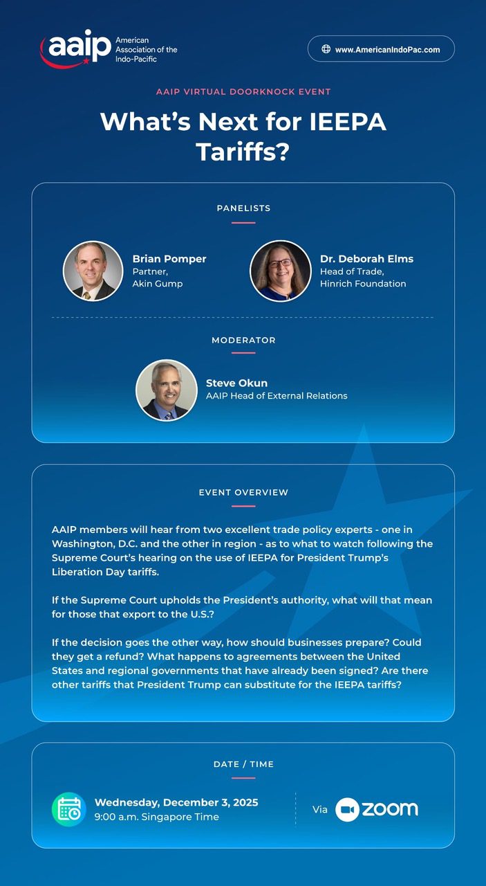 AAIP members will hear from two excellent trade policy experts – one in Washington, D.C. and the other in region – as to what to watch following the Supreme Court’s hearing on the use of IEEPA for President Trump’s Liberation Day tariffs. If the Supreme Court upholds the President’s authority, what will that mean for those that export to the U.S.? If the decision goes the other way, how should businesses prepare? Could they get a refund? What happens to agreements between the United States and regional governments that have already been signed? Are there other tariffs that President Trump can substitute for the IEEPA tariffs?