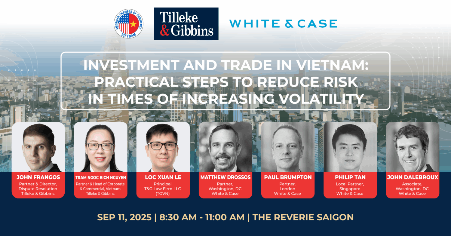 Tilleke & Gibbins and White & Case are pleased to present this seminar on Investment and Trade in Vietnam: Practical Steps to Reduce Risk in Times of Increasing Volatility. This session will highlight key economic trends, regulatory updates, and sector opportunities, while offering practical guidance on managing political, trade, and supply chain risks. The experts will share their best practices for investment protection and preparing for and managing international disputes should they arise, including through the use of alternative dispute resolutions tools such as international arbitration. Join us to gain essential insights and strategies to safeguard and grow your investments amidst a changing global landscape.