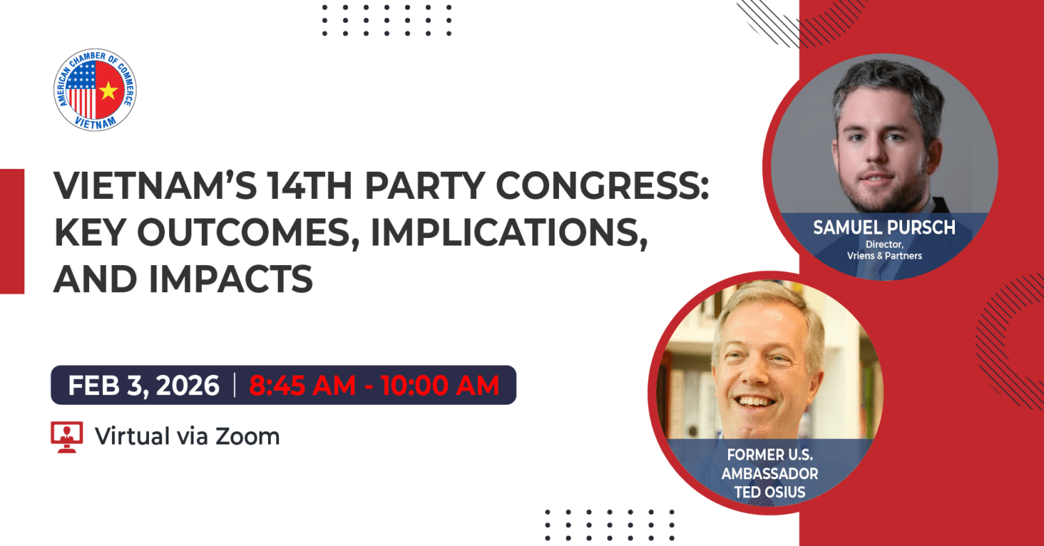 Join us virtually on Tuesday morning, February 3, 2026 to better understand how these decisions will impact the private sector. Samuel Pursch, Director at Vriens & Partners, and former U.S. Ambassador Ted Osius will deliver high-level analysis on what the Congress outcomes mean for the business environment and Vietnam’s trajectory in the years ahead.