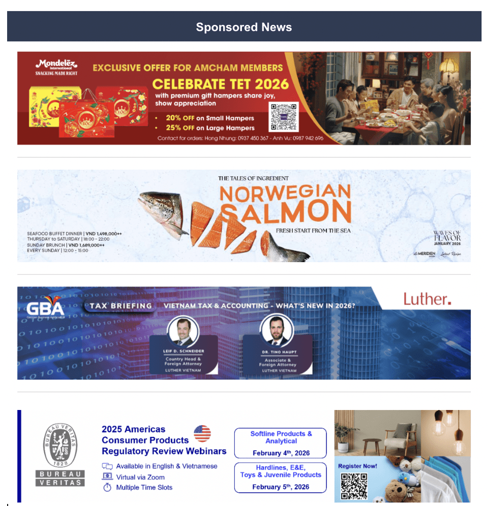 - Member rate: VND 3,600,000 per banner (applicable after the three complimentary banners offered annually by AmCham)