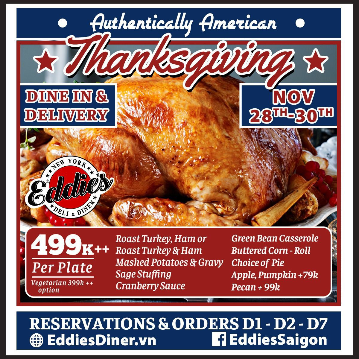 Join our Eddie’s Family for a Traditional American Thanksgiving Meal at our D1, D2, or D7 locations, or enjoy citywide delivery of individual, family, or group meals! 🏙🍽